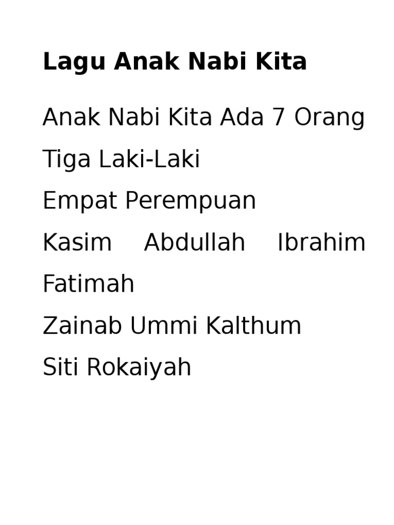 Anak anak nabi ada 7 orangnamun ternyata masih banyak nih yang belum tauanak anak nabi anak anak nabi ada 7 orang lirik lagu nya ada di video ini jadi lewat. Ia sempat mengalami masa islam dan ikut hijrah dari Mekah ke Madinah. Hampir semua orang di Indonesia tidak asing dengan lagu anak-anak selamat ulang tahun.